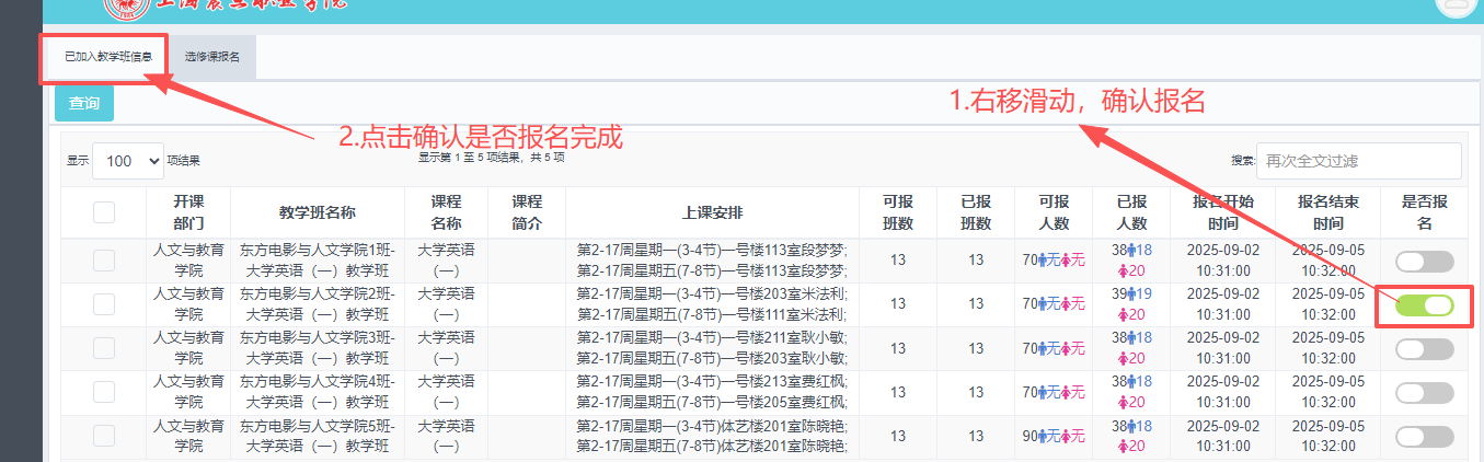 8.查看可報(bào)名教學(xué)班信息,選擇報(bào)名的教學(xué)班,右移滑動(dòng)確認(rèn)報(bào)名(注意:每門課程限報(bào)名一個(gè)教學(xué)班),報(bào)名后再點(diǎn)擊“已加入教學(xué)班信息”