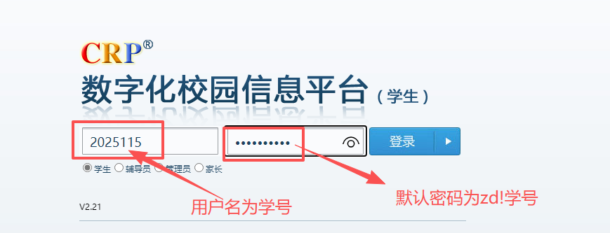 5.輸入用戶名(用戶名為學(xué)號(hào))及密碼(默認(rèn)密碼為zd!學(xué)號(hào),如學(xué)號(hào)為250001則默認(rèn)密碼為zd!250001)