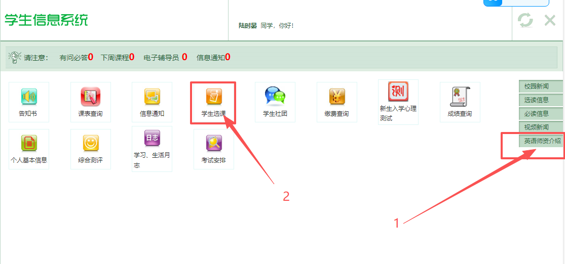 6.在選課前,可點(diǎn)擊“英語(yǔ)師資介紹”欄目,了解任課老師相關(guān)情況,然后點(diǎn)擊“學(xué)生選課”圖標(biāo),開始選課